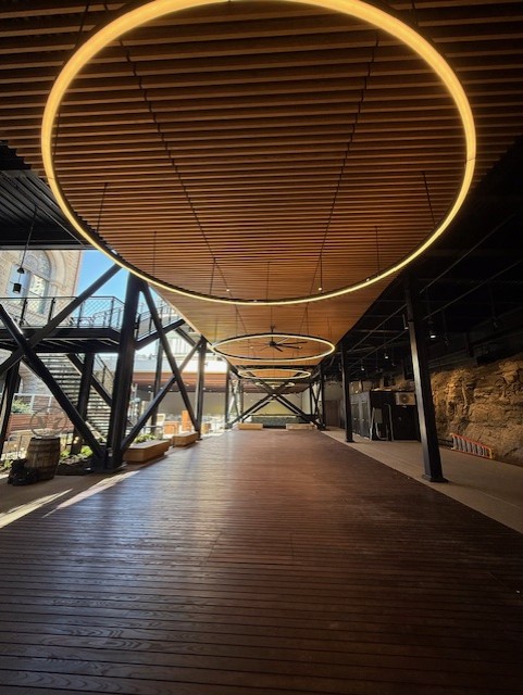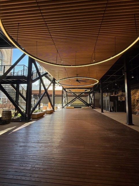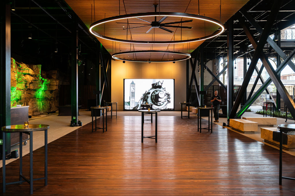 Framed by steel beams, layered textures, and warm ambient lighting, the space blends industrial architecture with a distinctly modern energy. What once served as a passage for movement and connection now sets the stage for celebration, creativity, and experience.